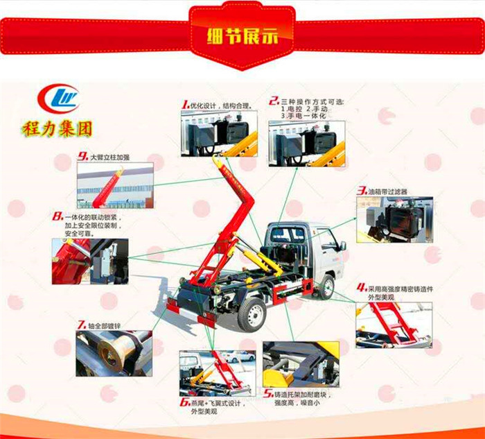 上装勾臂系统液压**采用手控一体阀,驾驶室内电控操作,操作简便灵活,电气**元件选用国内知名品牌,勾臂架采用优质低合金钢强度高柔性好,能够适应重载荷工作。